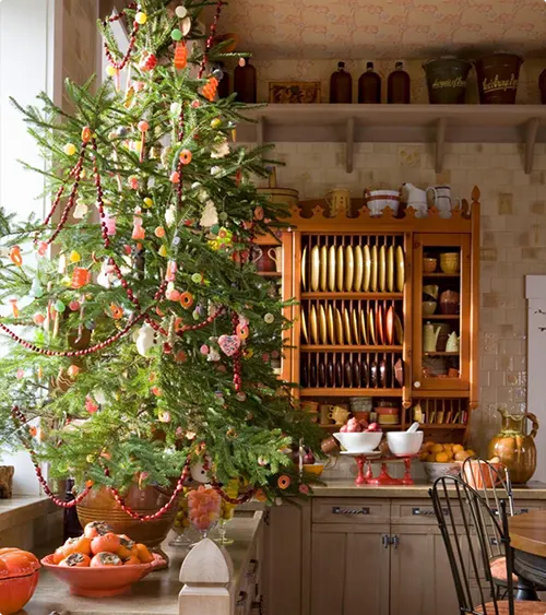 This tree lives in a kitchen and it’s decorated with orange and coral toned ornaments. Totally unexpected but it works with the rustic shelves and pottery in the background.