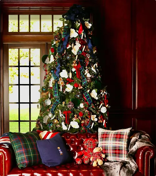 A Ralph Lauren Christmas Tree style combines timeless elegance with cozy luxury. It often features plaid ribbons, equestrian accents, gold and red ornaments, vintage textures, and natural greenery. The look reflects Ralph Lauren’s signature mix of classic Americana and refined sophistication.