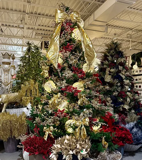 This massive tree looks like it belongs in a hotel lobby. Gold ribbons cascade down in huge loops and the whole thing drips with red and gold florals.