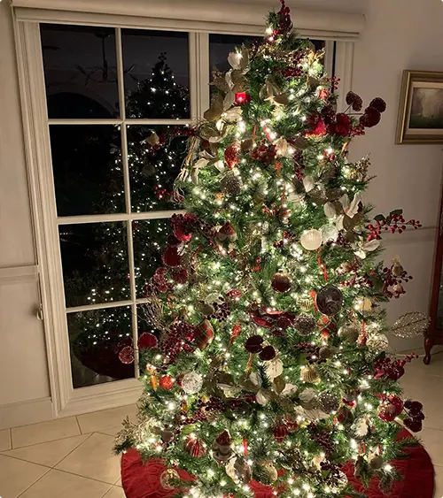 This tree has burgundy ornaments mixed with white flowers and lots of greenery woven throughout. It feels less decorated and more like it grew that way.