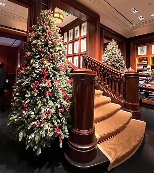 Two trees flank a curved wooden staircase in what looks like a Ralph Lauren store. Cream and red flowers cover both trees along with burgundy accents.