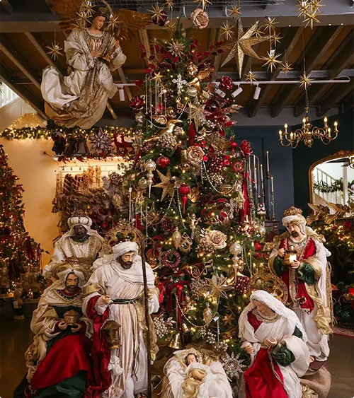 This tree sits in what looks like a full holiday display with nativity figures all around. Deep reds and golds dominate the ornament choices with that dark backdrop making everything richer.