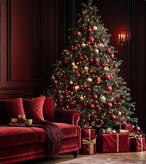 The decorations often have plaid ribbons, shiny gold ornaments, and deep red bows that make everything look rich and happy. You might see touches of leather, wood, and even horse-inspired designs that remind you of the countryside.