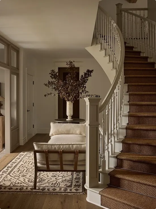 Everything here is soft and warm. A curved staircase with a woven brown runner curves through a creamy neutral space, and a linen bench sits right at the base.