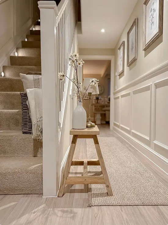 This narrow hallway entryway makes the most of every inch. A simple wooden stool sits right at the stair post holding a white ceramic vase with delicate white blooms.
