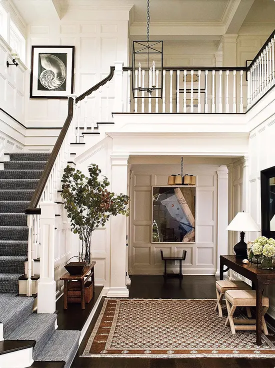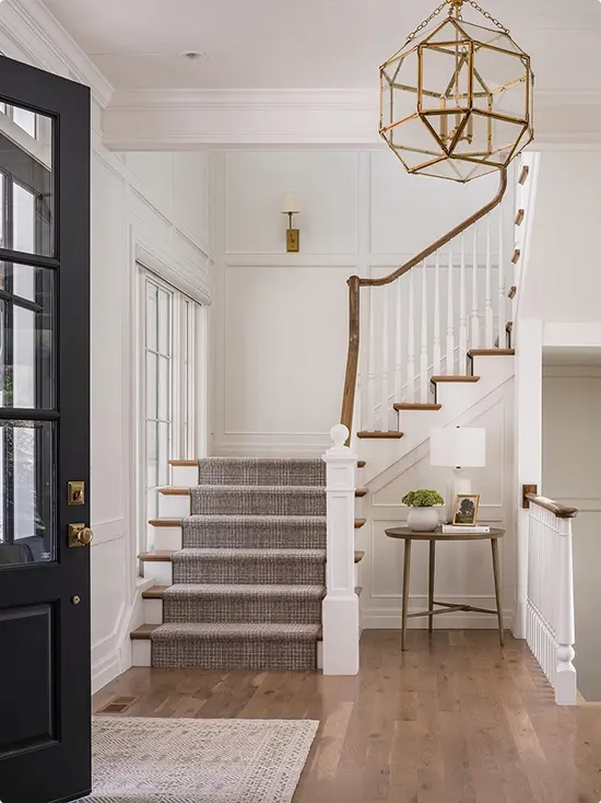 White paneled walls, warm wood floors, and a textured gray stair runner — this entryway feels polished but completely approachable.