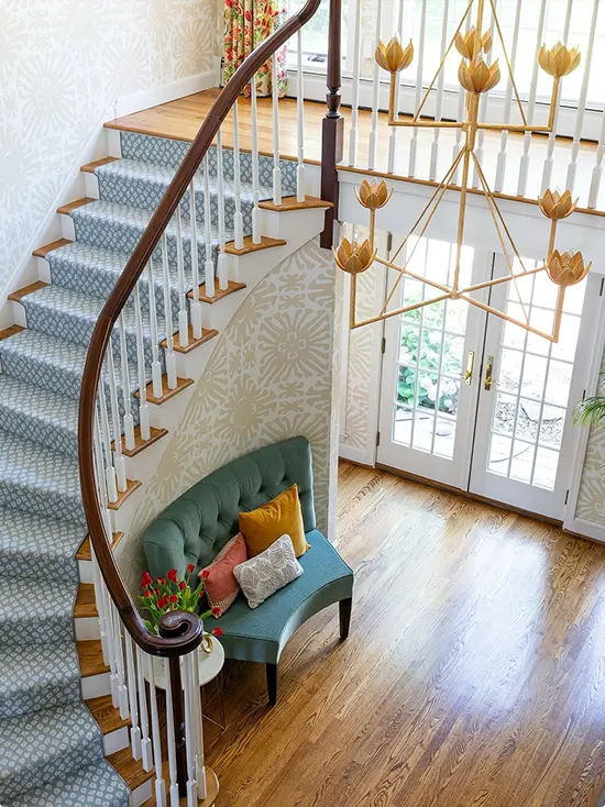 This entryway has so much charm. A curved staircase is dressed in a blue geometric runner, and a tufted teal settee sits right underneath it with colorful throw pillows.