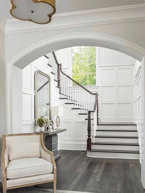 A wide white arch frames the staircase here, and it gives the whole entryway a soft, dreamy feel. Dark hardwood floors contrast against all the white and add just the right amount of depth.