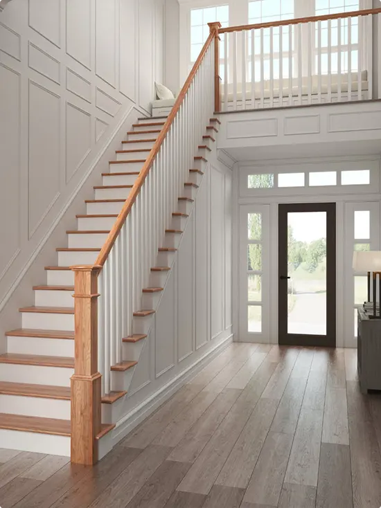 Clean, calm, and classic. This entryway pairs warm honey-toned stair treads with crisp white balusters and soft gray panel molding on the walls.