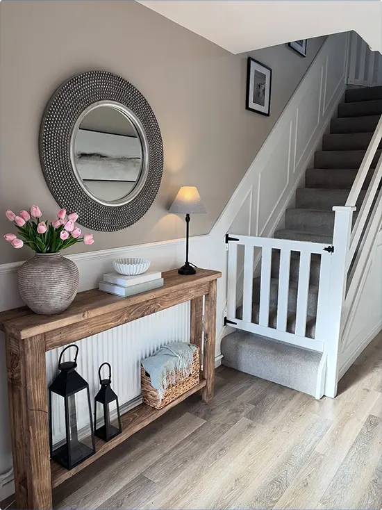 Maybe you add a slim bench under the stairs. Or a few hooks that actually look cute. Even a tiny console table can change the whole vibe. It’s those small choices that turn “just an entryway” into something that feels warm and put together.