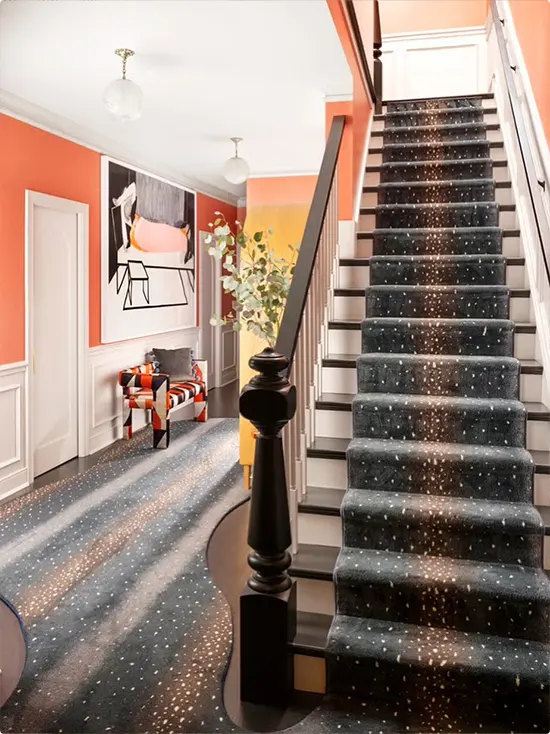 This one is bold and it works. Deep coral-painted walls pair with a dark stair runner covered in gold speckles — it almost looks like a night sky underfoot.