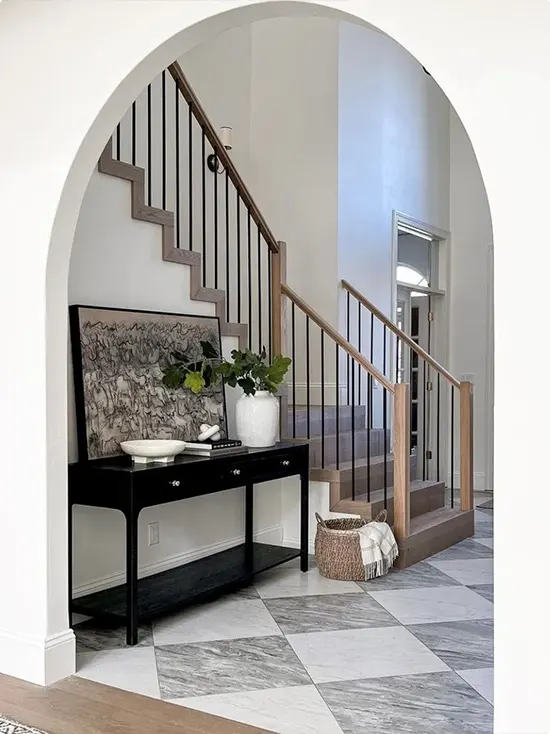 A clean white arch frames this staircase perfectly. Underneath it sits a sleek black console table with a large vase of greenery and a piece of moody art leaning against the wall.