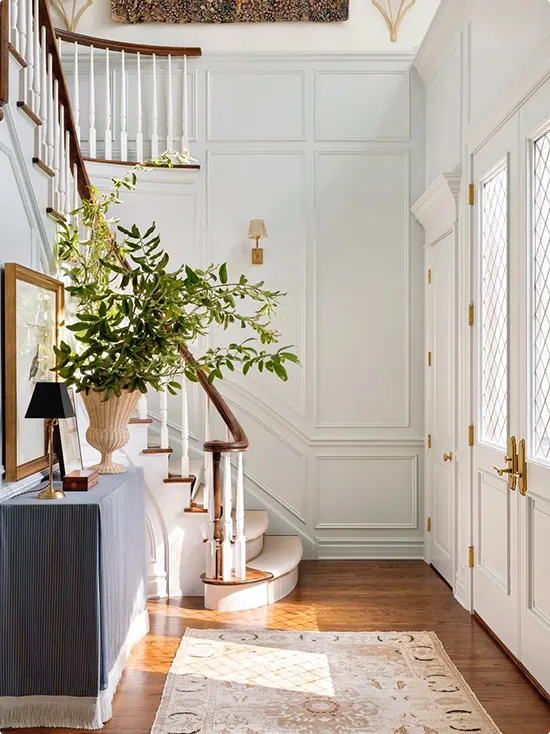 This entryway leans into classic elegance without feeling stuffy. Tall white panel molding covers the walls, and warm wood floors bring in just enough coziness.