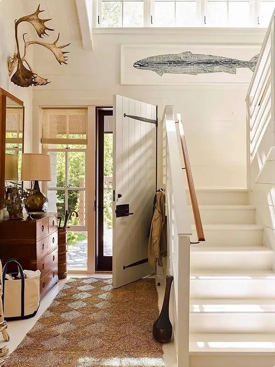 This one has real personality. A large fish print hangs above the staircase, and a set of antlers is mounted on the wall nearby — it’s quirky and charming.