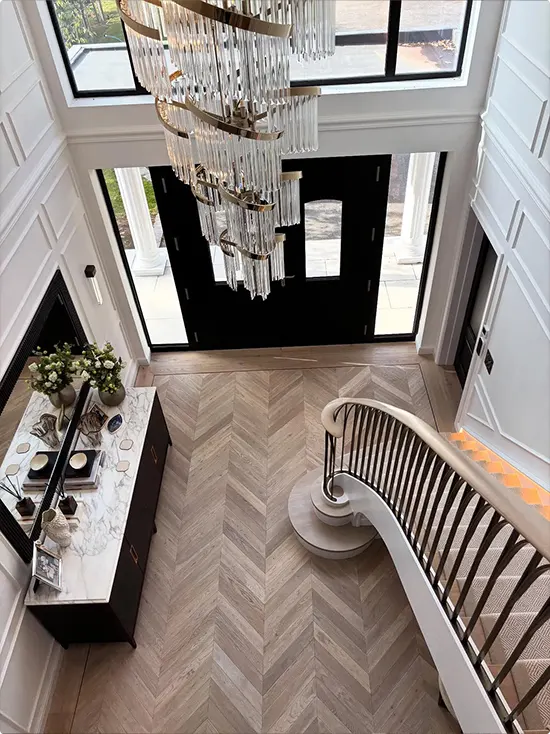 Viewed from the upper landing, this grand entryway shows off a gorgeous herringbone wood floor that just draws your eye in every direction.