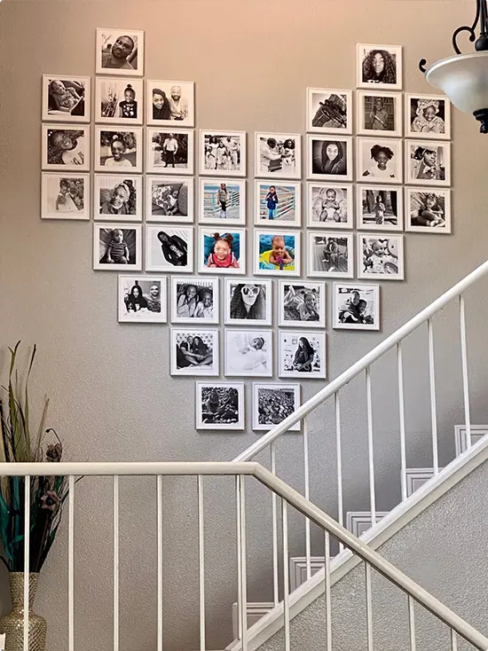 Dozens of matching white square frames arranged into the shape of a heart — this idea is genuinely sweet.