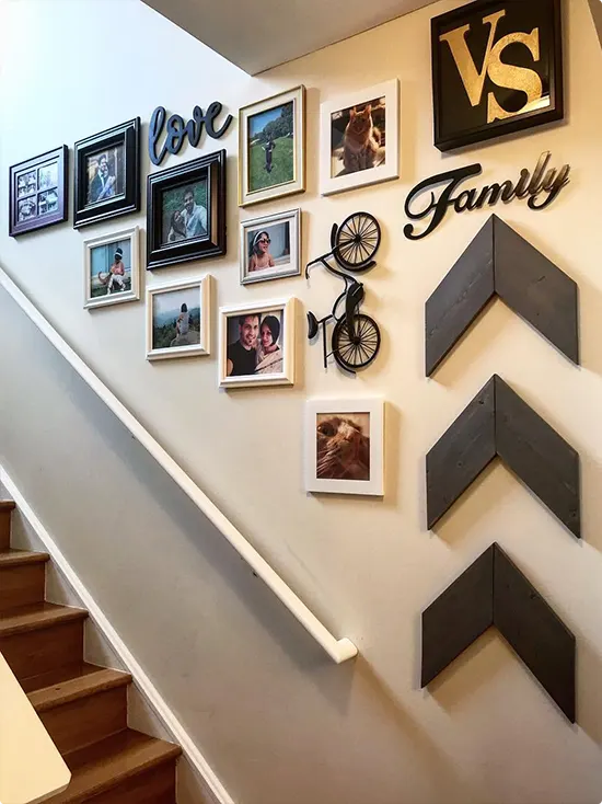 Photos, word cutouts like “love” and “family,” a decorative bike, and dark wooden chevron arrows — this wall is packed with personality.