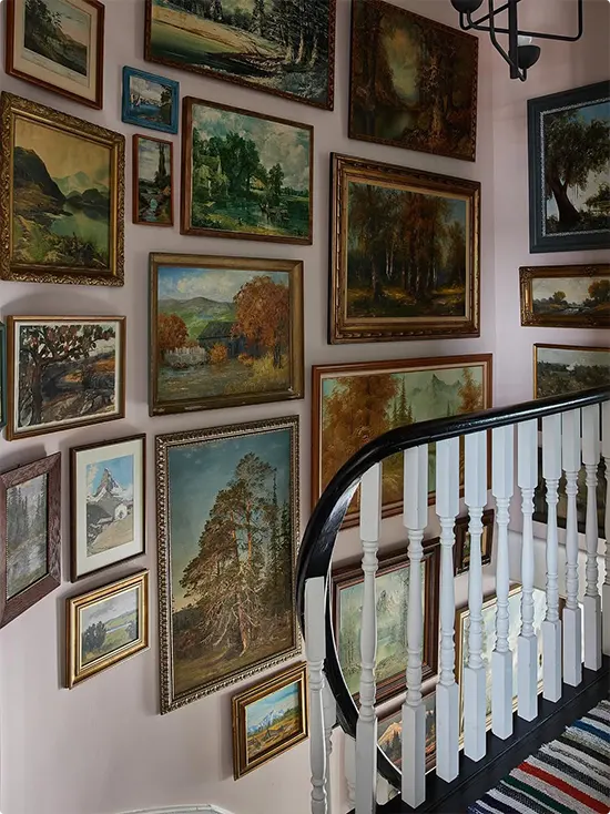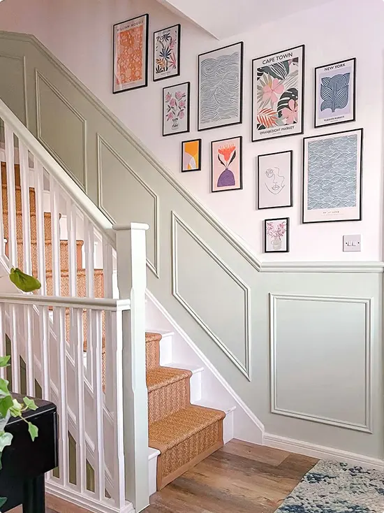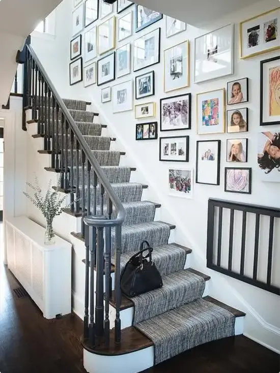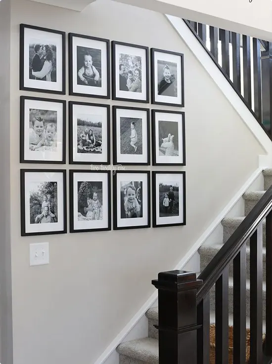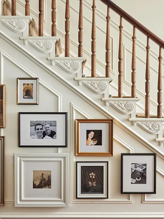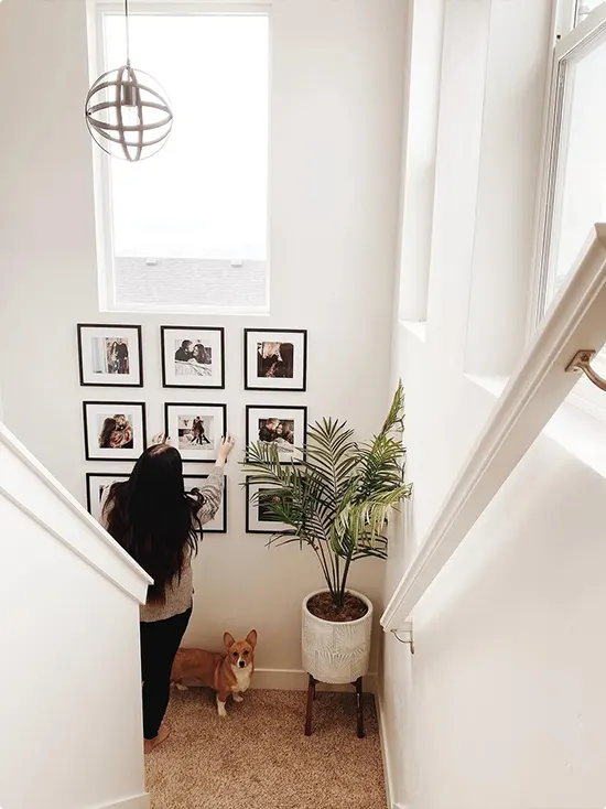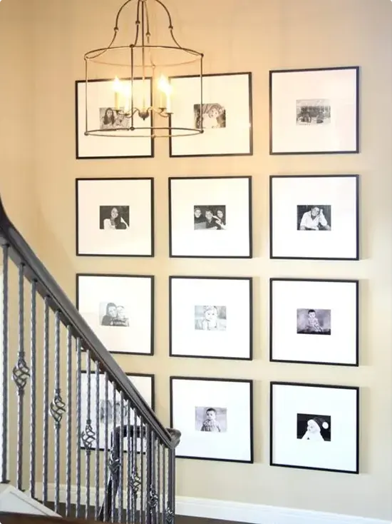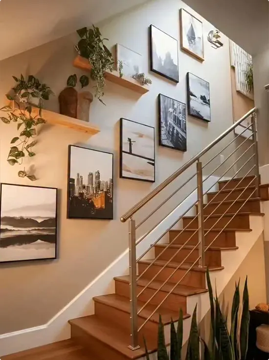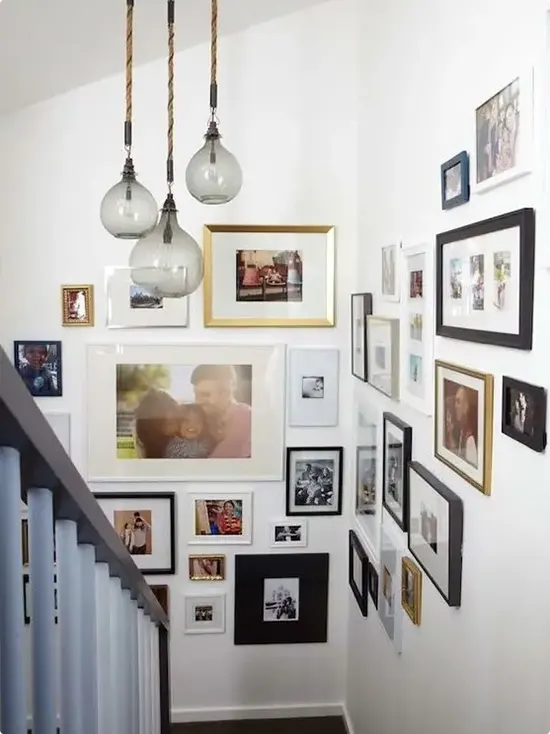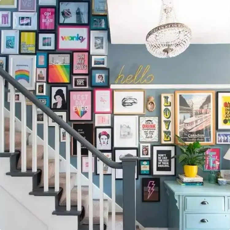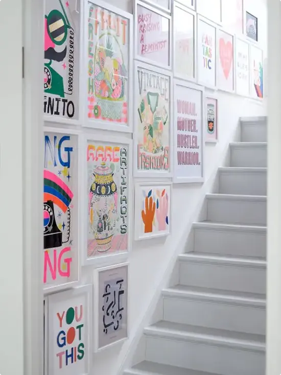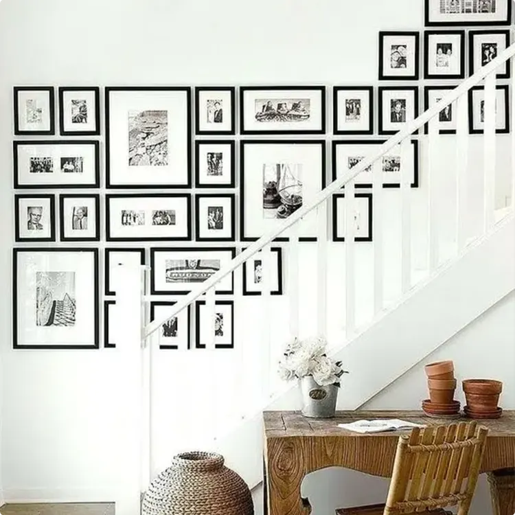 There’s no set number. Some stairway gallery walls look great with just 6 to 8 frames. Others use 20 or more. It really depends on the size of your wall and the look you’re going for.
