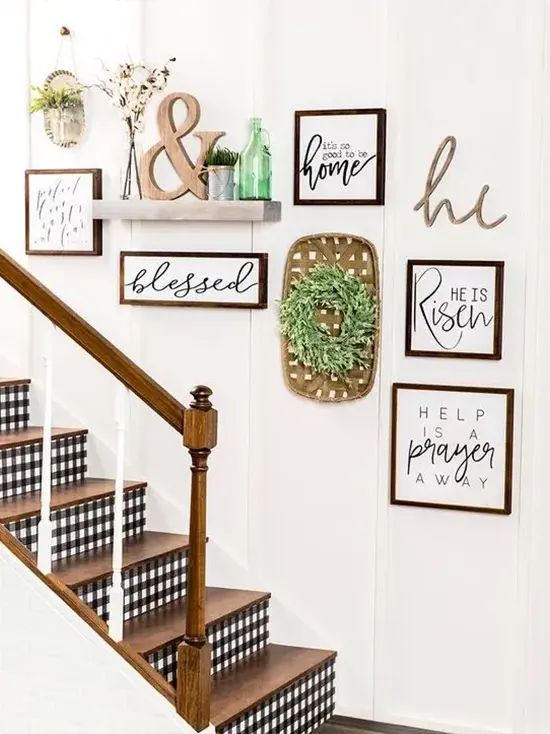 Framed word signs saying things like “blessed,” “it’s so good to be home,” and “help is a prayer away” fill this staircase wall.