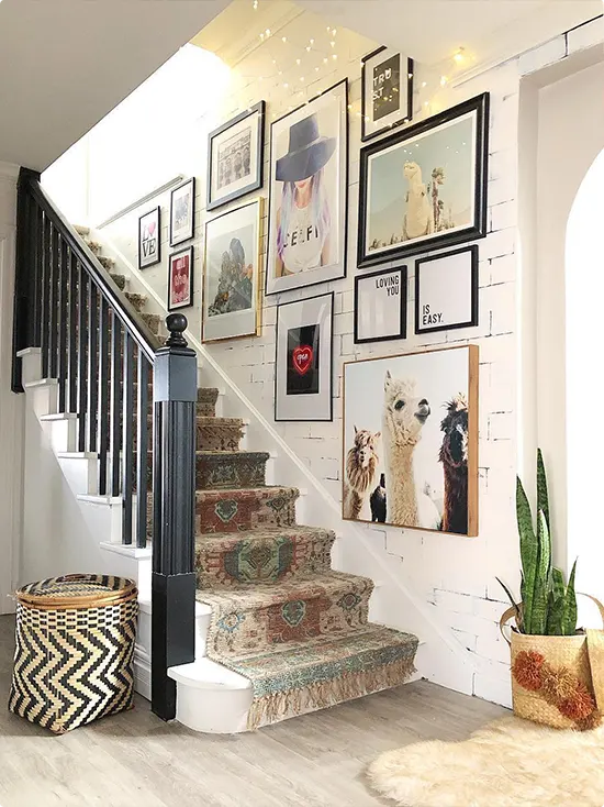 The mix of framed prints and a patterned stair runner makes this feel very boho and very cool.