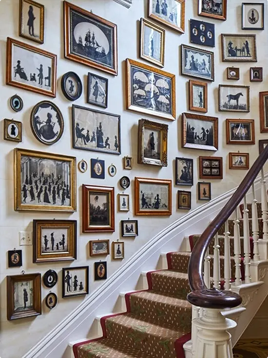 This wall is covered in vintage silhouette prints — people, horses, scenes — all in different gold and wood frames.