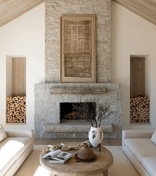 The whitewashed stone in this room has such a beautiful texture, and those built-in wood storage nooks on either side are both practical and stunning.