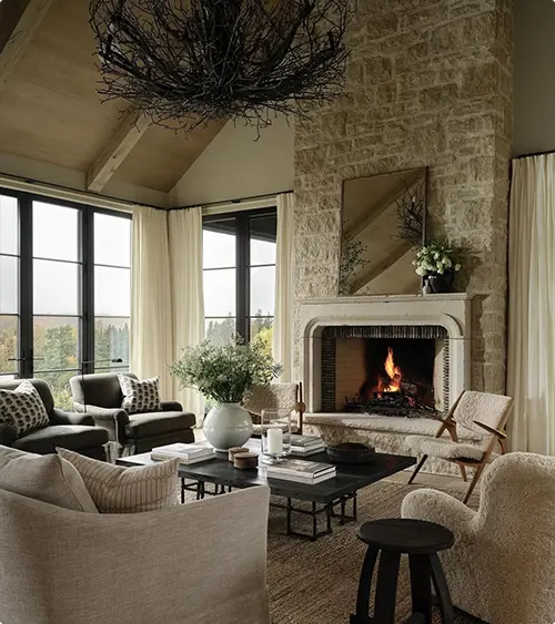 The soft curves of this stone fireplace feel elegant and a little unexpected, especially paired with that dramatic twig chandelier overhead.