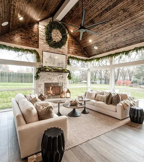 Floor-to-ceiling windows flanking this gray stone fireplace bring the outdoors in while keeping the focus on that beautiful stacked stone.