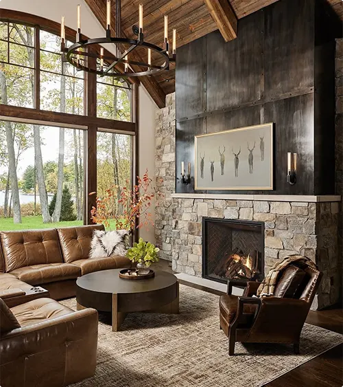 The rich brown tones in this stacked stone create such a warm, earthy feeling that grounds the whole room.