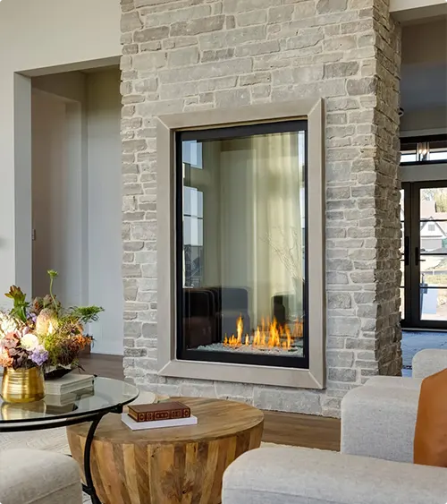 That vertical glass-front fireplace insert is such a modern touch, letting you see the flames from multiple angles.
