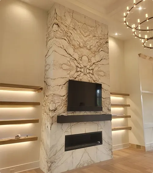 Those backlit floating shelves on the side create a warm glow that adds ambiance even when the fireplace isn’t lit.
