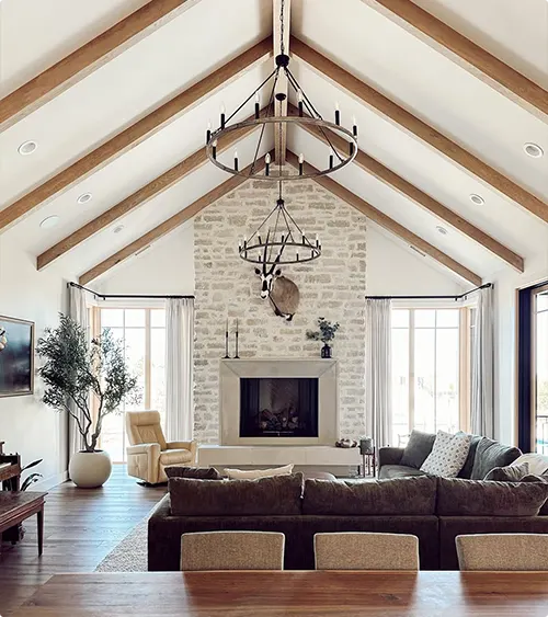 Those exposed wood beams against the white ceiling create such a dramatic backdrop for the light stone fireplace.