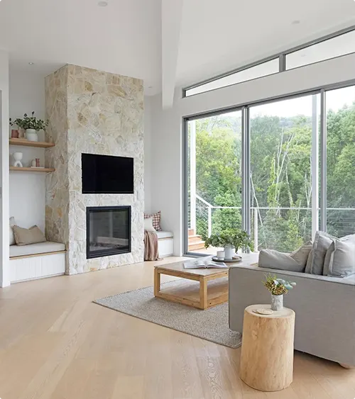 The light stone in this corner fireplace brings warmth to an otherwise very minimal, modern space flooded with natural light from those huge windows.
