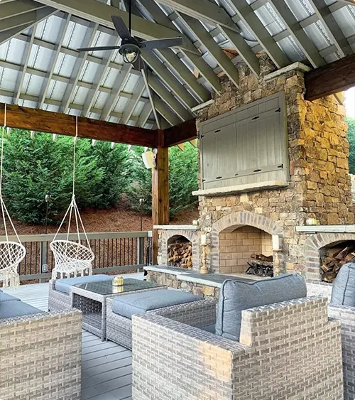 This outdoor fireplace is framed by thick stone columns that create a sense of grandeur and old-world charm.