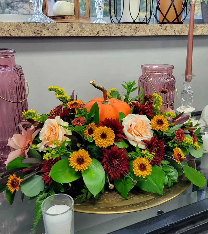 This centerpiece is all about simplifying the design by using a decorative platter or tray as the base, it instantly pulls all the elements together. The design features a single, bright orange mini pumpkin as the clear focal point, surrounded by a tight ring of vibrant, lush flowers.