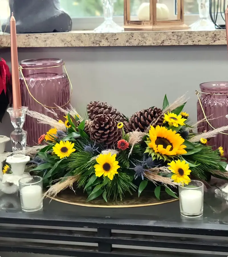 It uses lush pine boughs for a rich green foundation, contrasting beautifully with the bright yellow of the sunflowers and little pops of blue thistle. Giant pinecones piled in the center give it that crucial autumn texture, and the low profile ensures great table conversation.
