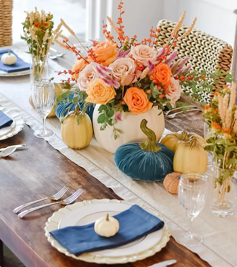 What makes it stand out, though, is the addition of decorative elements like those rich, deep blue velvet pumpkins scattered along the table. The blue offers a bold, high-contrast pop against the warm floral tones, making the entire design feel instantly fresh and modern.