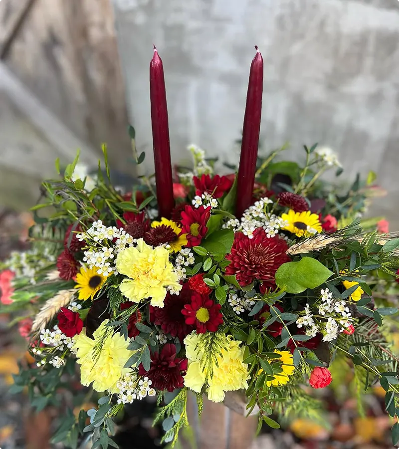 Just like the earlier idea, it uses twin taper candles for height, but these are a striking burgundy red, which feels so romantic and warm. The florals are packed densely, mixing chunky yellow carnations, small sunflowers, and dark red mums with lots of fresh greenery and wispy wheat stalks.