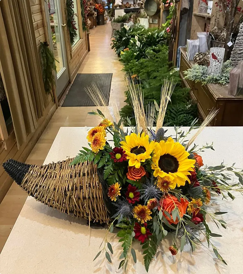 Nothing says Thanksgiving abundance like a gorgeous, overstuffed cornucopia, and this design really captures that feeling. The centerpiece uses a traditional woven horn overflowing with vibrant, cheerful elements, making it the perfect focal point.