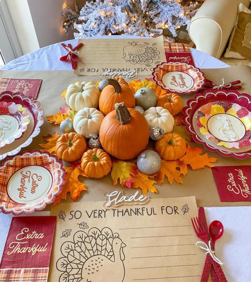 This works beautifully because the focus isn’t just decoration, it’s on interaction, using a craft paper runner and “Thankful For” activity sheets. The whole setup feels warm and inviting, proving a centerpiece doesn’t need expensive florals to be festive.