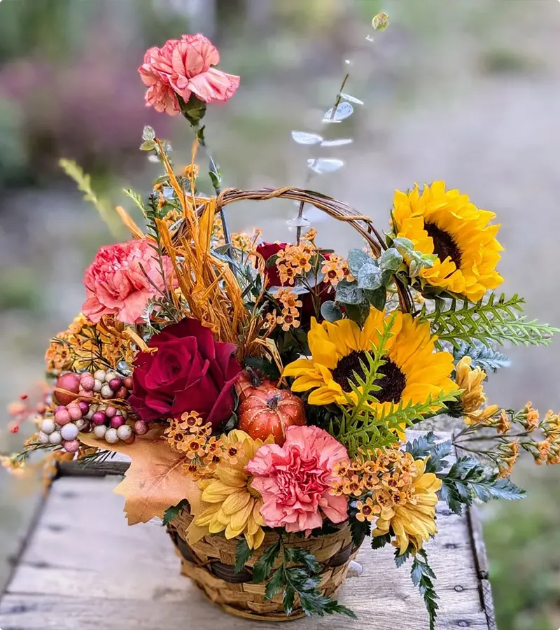 If you’re going for that super-traditional, cozy Thanksgiving feel, you can’t go wrong with a centerpiece built into a woven basket. This design mixes bold, sunny colors, the bright sunflowers and deep red roses, with softer touches like pink carnations for a lively contrast.