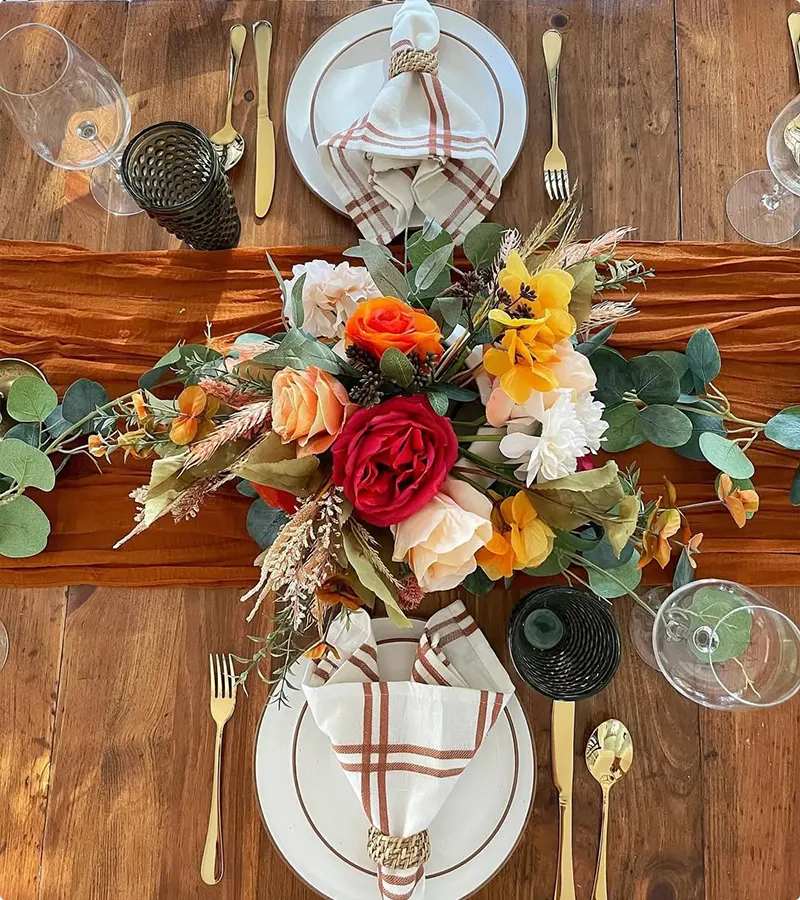 This look is pure elegance without losing that cozy, warm Thanksgiving feeling, you know? Start with a flowing, rust-toned gauze runner, it instantly lays down a beautiful autumnal foundation for everything else.