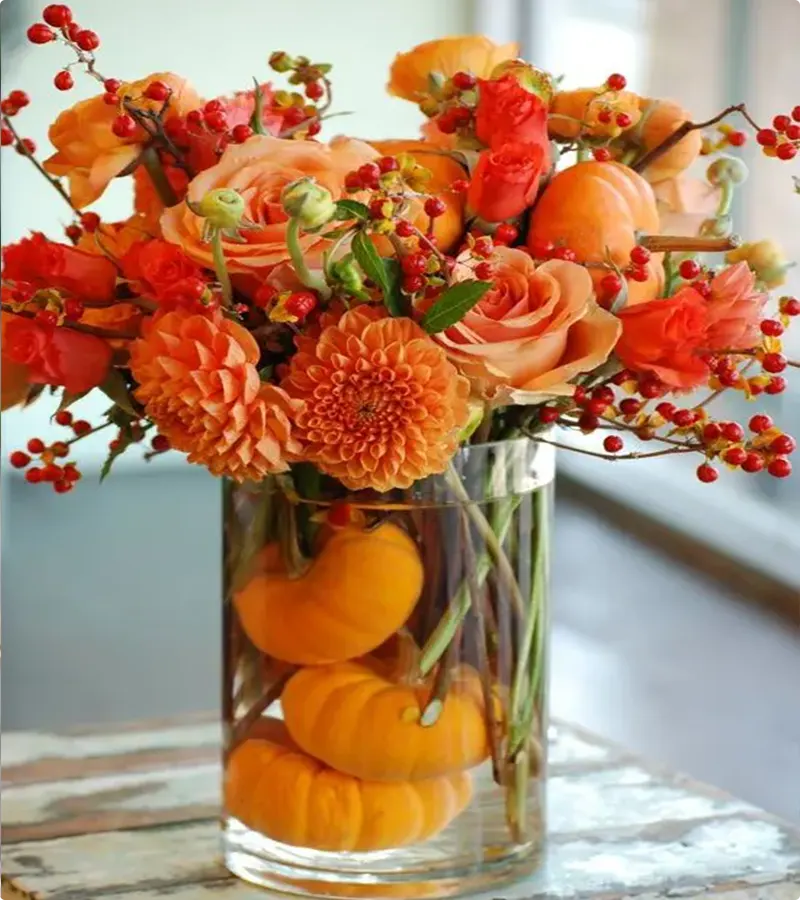 The floral arrangement itself is a beautiful monochrome study in oranges, mixing roses, ranunculus, and dahlias, along with bright red hypericum berries. This design works because the clear glass allows you to see the submerged pumpkins, giving the entire centerpiece a beautiful, layered visual depth.