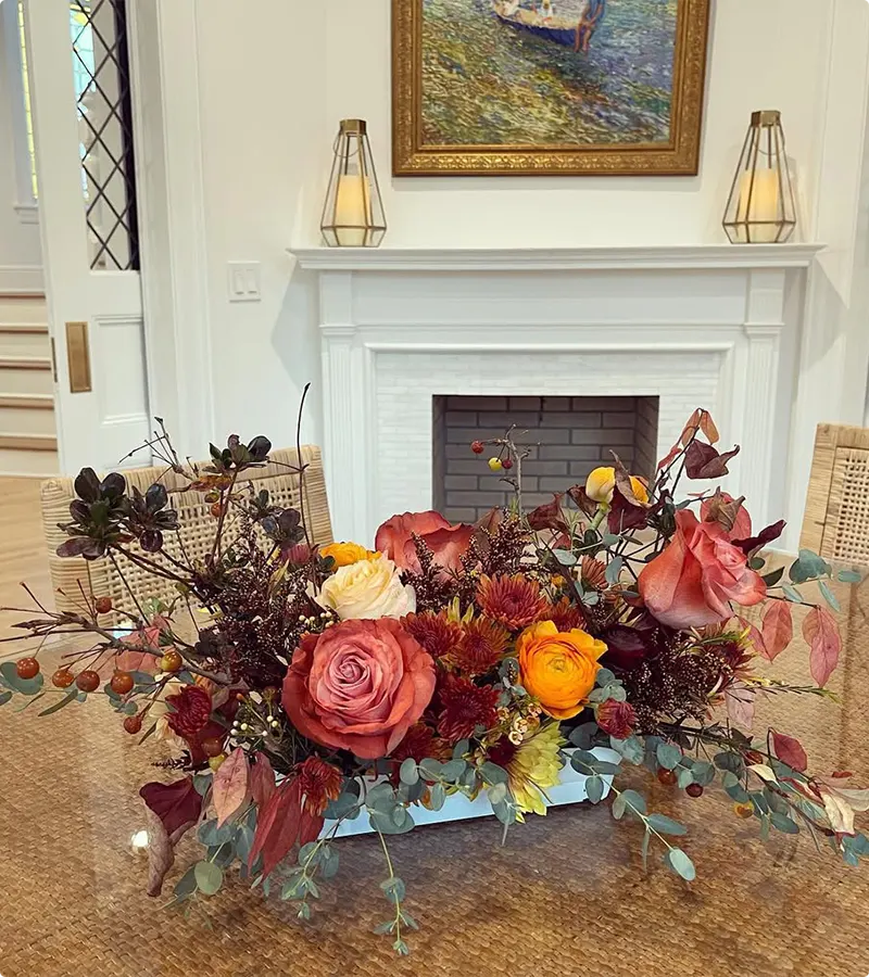 It combines rich reds, deep oranges, and soft peach roses, making it feel very traditional and abundant. This low and compact arrangement works perfectly on a dining table because it makes a statement without being distracting or getting in the way of the food.