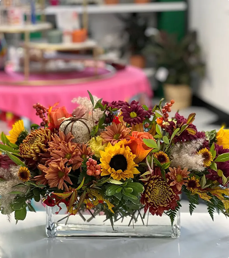 The design uses a clear, rectangular vase to hold an overflowing arrangement of sunflowers, mums, and roses in every gorgeous autumnal shade.