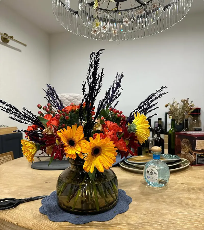 Using a smoke-grey or amber glass vase helps ground the bright colors and gives the arrangement a sophisticated, moody feel, it’s less country, more chic. This works best for a round or small table where height isn’t an issue, letting the flowers stand alone as the singular focal point.