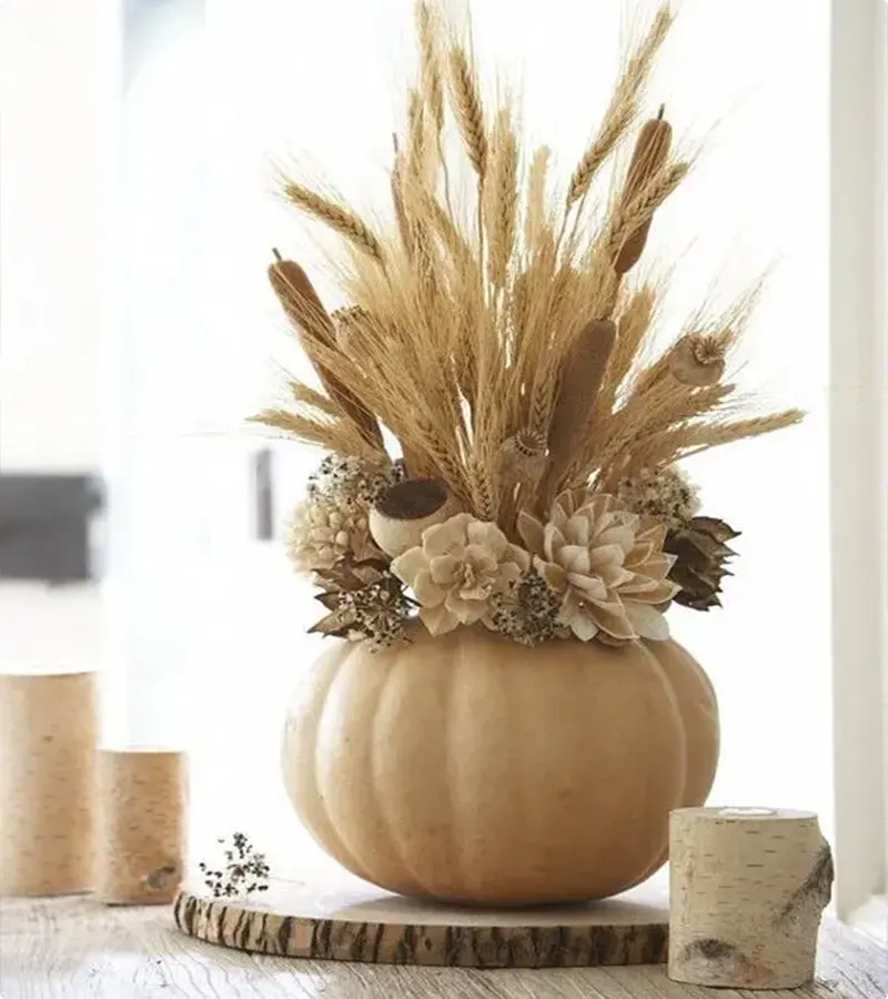 This centerpiece is fantastic if you love that modern, natural neutral aesthetic, think creams, tans, and browns. It starts with a simple, pale tan or white pumpkin serving as a unique, earthy vase.