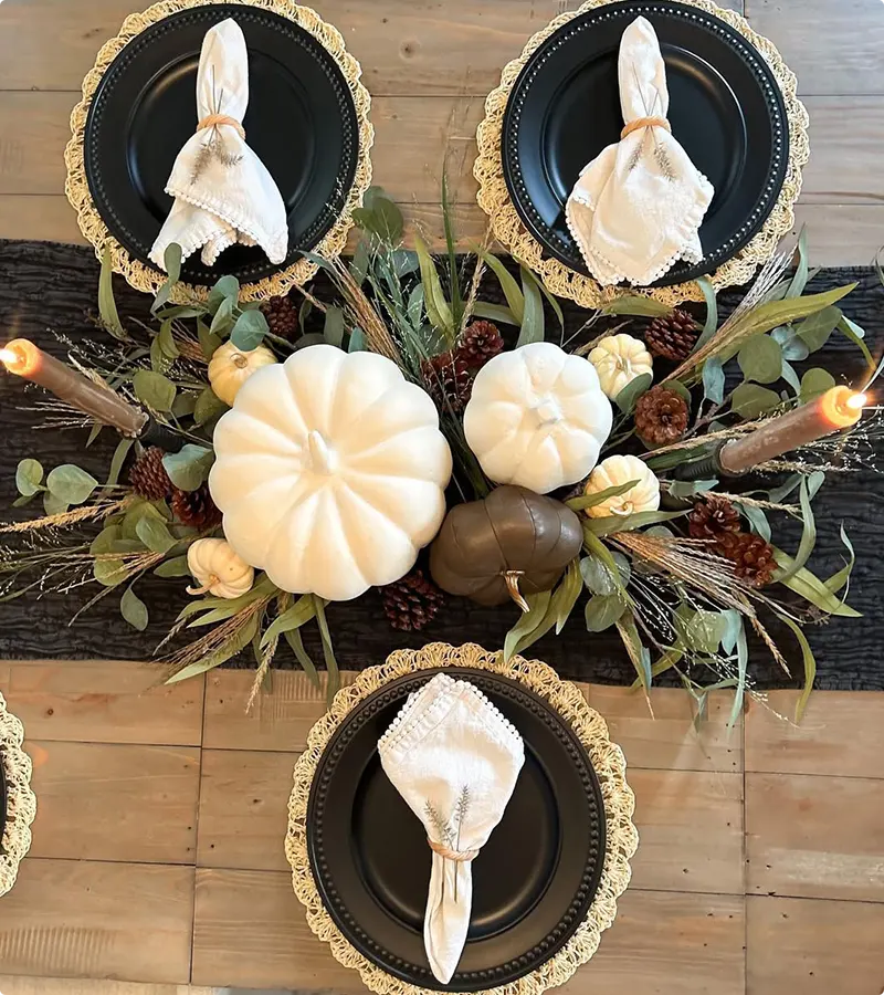 If you’re hosting a modern dinner, this sleek centerpiece is perfect because it swaps traditional colors for deep, moody hues. The base is a dramatic black table runner that makes the bright white pumpkins and gold accents really pop.