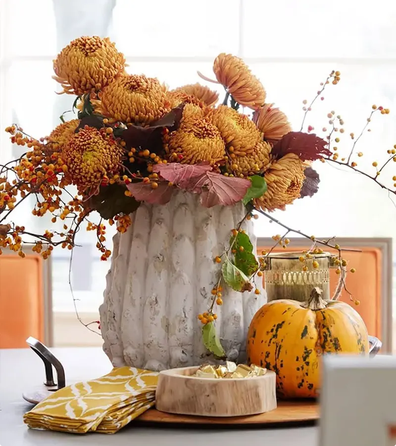 It works so well because the use of fern and lush greenery around the edges lets the arrangement spill out naturally, making it look like a fresh-cut meadow. Plus, adding a tiny, textured mini pumpkin tucked inside instantly signals Thanksgiving!