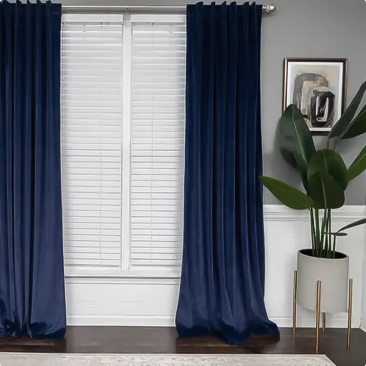 Navy blue curtains add depth right away. Suddenly the room feels more grounded.